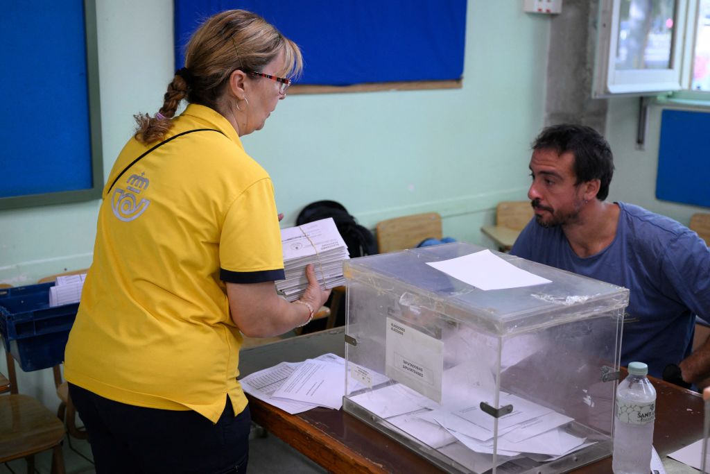 Un cartero entrega el voto por correo al presidente de una mesa electoral en Madrid, durante las elecciones generales españolas, el 23 de julio de 2023. (THOMAS COEX/AFP a través de Getty Images).