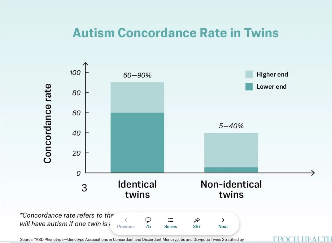 Si un gemelo idéntico tiene autismo, la probabilidad de que el otro también lo tenga se sitúa entre el 60 % y el 90 %, frente a entre el 5 % y el 40 % en los gemelos no idénticos (mellizos).