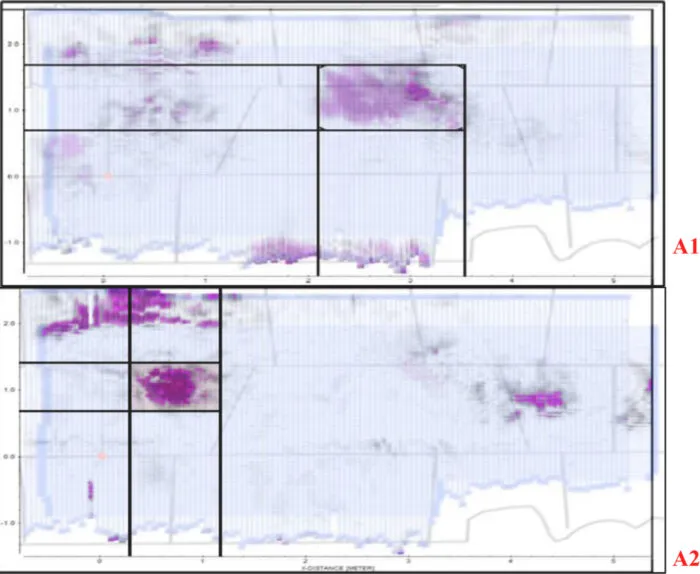 Justo detrás de la fachada lisa, cerca del punto que Van den Hoven había señalado, los científicos detectaron dos anomalías. La primera (A1) se sitúa en el centro, detrás del bloque trapezoidal de granito, y la segunda (A2), en la parte superior izquierda de la superficie pulida de la pirámide.