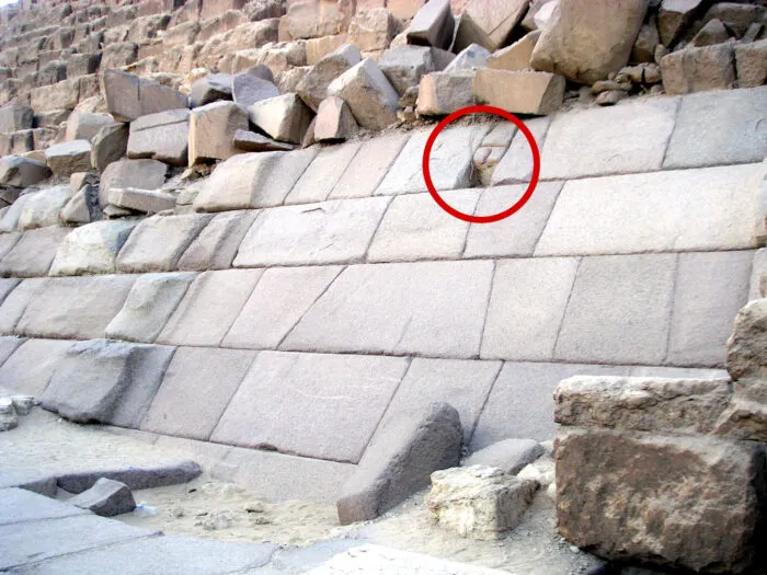 Según Van den Hoven, hay indicios de un intento coordinado de fracturar el bloque a golpes, probablemente con un cincel metálico. Sin embargo, se abandonó antes de conseguirlo. Queda la incógnita de quién más quiso acceder a la pirámide por este punto.