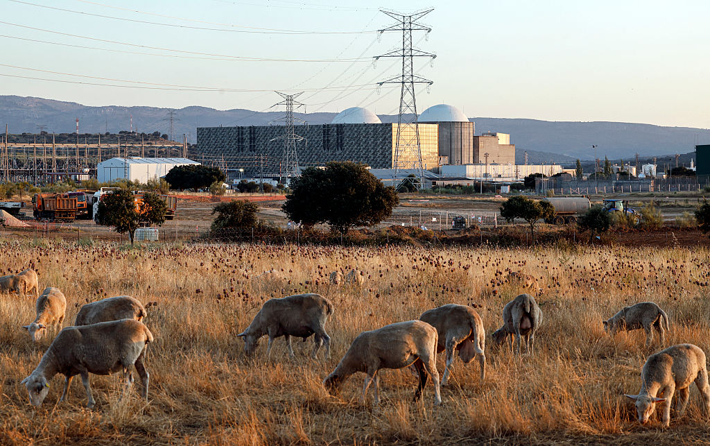 Un rebaño de ovejas pasta cerca de la central nuclear de Almaraz, en el oeste de España, el 3 de julio de 2025. La central, una de las instalaciones nucleares más antiguas de España, se encuentra en la provincia de Cáceres, en la región de Extremadura. Foto: Oscar del Pozo/AFP vía Getty Images.