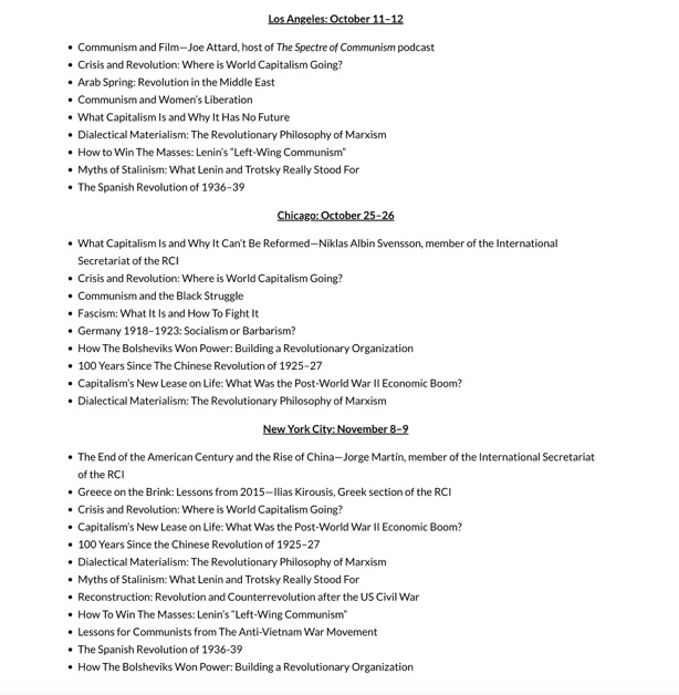 – Los Ángeles: «Crisis y revolución: ¿Hacia dónde va el capitalismo mundial?», «Comunismo y liberación femenina» y «Mitos del estalinismo: lo que Lenin y Trotsky realmente defendían».