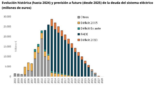 A 31 de diciembre de 2024, la deuda pendiente del sistema –que alcanzó cerca de 29 000 millones de euros en 2013–, se había reducido a 5727 millones de euros (el 81,6 % en bonos FADE). En 2025, los usuarios en las boletas eléctricas deberán pagar una anualidad estimada en 2390 millones de euros, con un coste medio del 3,498 % de interés. La extinción de la deuda se prevé para 2028, según la Comisión Nacional de los Mercados y la Competencia.