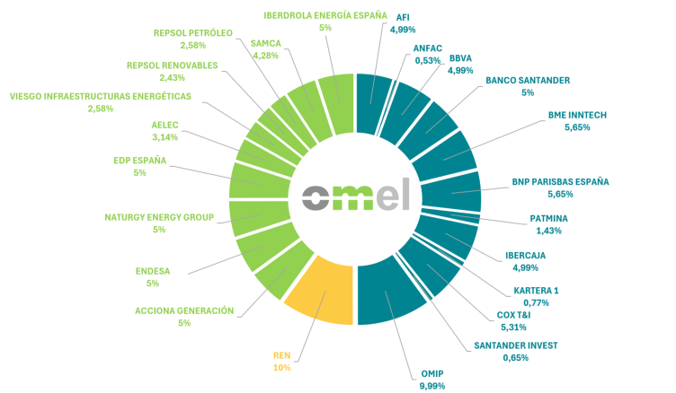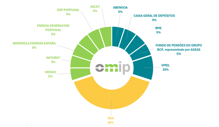 OMI se estructura en dos sociedades tenedoras de acciones, OMEL y OMIP. Como accionistas de OMEL, entre otros, figuran las cuatro grandes eléctricas —Iberdrola, Endesa, Naturgy y EDP España— con el 5 % cada una, junto a otros industriales, entre ellos Acciona Generación 5 %, AELEC 3,14 %, Repsol Petróleo 2,58 %, Repsol Renovables 2,43 %, Viesgo Infraestructuras 2,58 %, SAMCA 4,28 %) y con participaciones relevantes de REN 10 % y OMIP 9,99 % y grandes bancos. Algo similar ocurre en el caso de OMIP.
