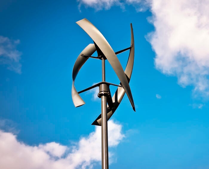 Algunas viviendas incorporan aerogeneradores de eje vertical, en los que el eje de giro es perpendicular al suelo y las aspas se disponen de abajo arriba, a veces con ligera inclinación. Son menos comunes que los de eje horizontal.