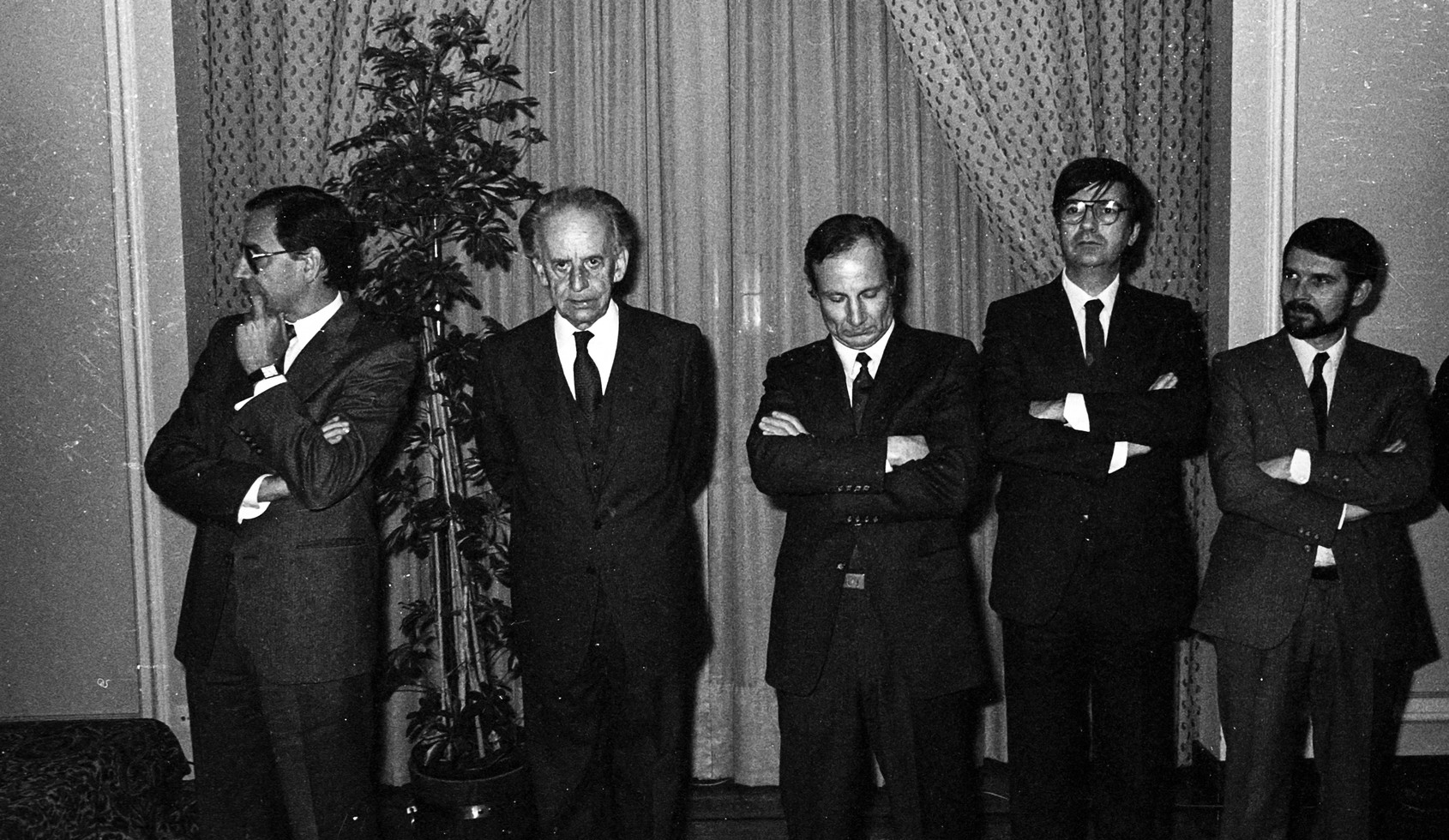 Ernesto Lluch (segundo por la derecha) posa junto a Alfonso Guerra (primero por la izquierda) el 4 de mayo de 1986. Ministerio de la Presidencia. Gobierno de España vía Wikimedia Commons.
