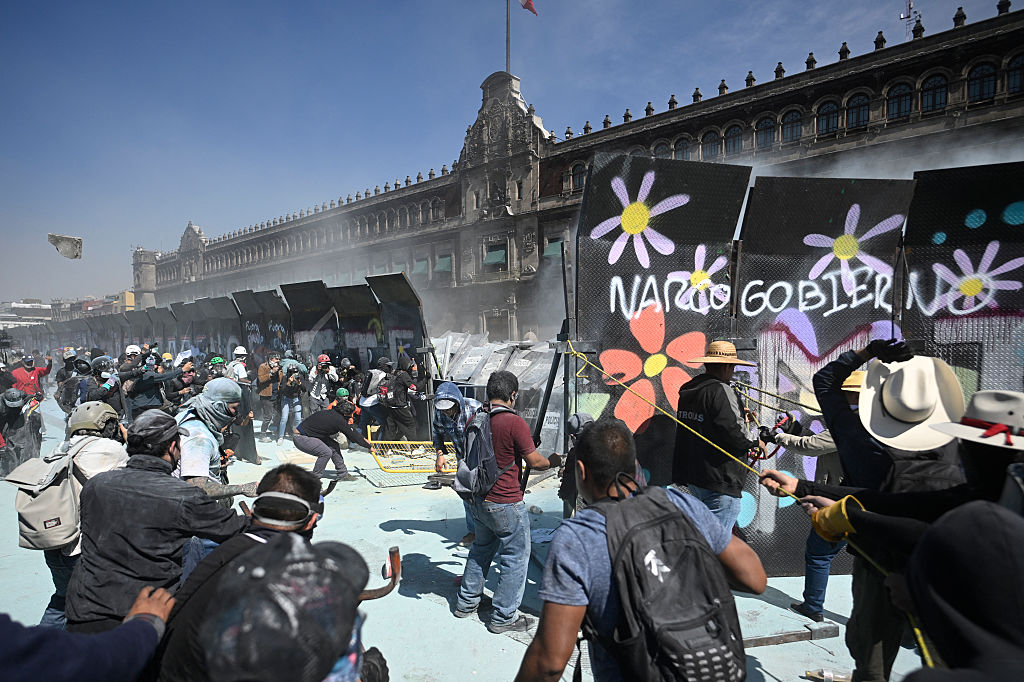 En la Ciudad de México, el 15 de noviembre de 2025, miles de personas intentaron derribar las barricadas que protegían el Palacio Nacional en la Plaza del Zócalo durante una manifestación contra el gobierno de la presidenta Claudia Sheinbaum. Ese mismo sábado, miles de personas marcharon por las calles de la Ciudad de México para protestar contra la violencia del narcotráfico y las políticas de seguridad del gobierno de la presidenta Sheinbaum. Foto de Alfredo Esterla / AFP vía Getty Images